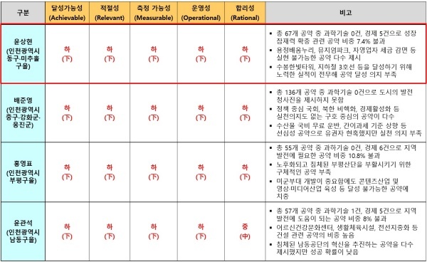 ▲ 인천광역시 동구·미추홀구을 윤상현 의원 공약 평가 결과(달성가능성/적절성/측정가능성/운영성/합리성) [출처 = 국가정보전략연구소(iNIS)]