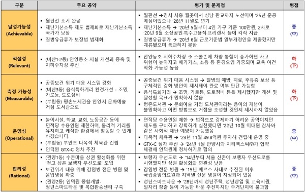 ▲ 경기도 안양시 동안구갑 민병덕 의원 공약 평가 결과(달성가능성/적절성/측정가능성/운영성/합리성) [출처=국가정보전략연구소(iNIS)]