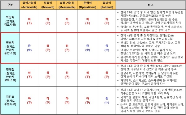 민 의원이 제시한 48개 공약은 △달성가능성 △운영성 △합리성 등 3개 분야에서 중(中) 평점을 받았으며 △적절성 △측정가능성 등 2개 영역은 하(下) 평점을 받았다.