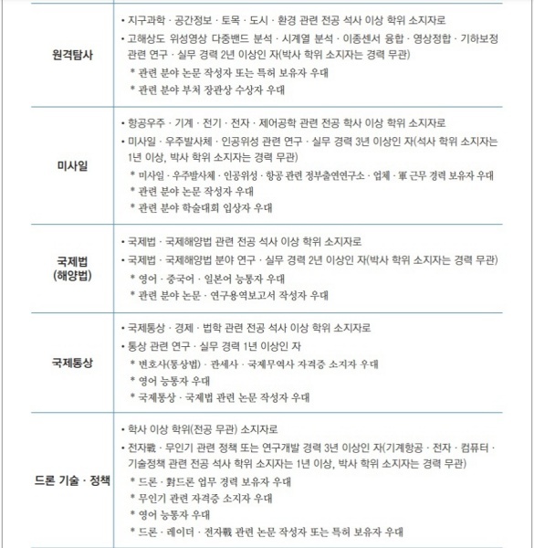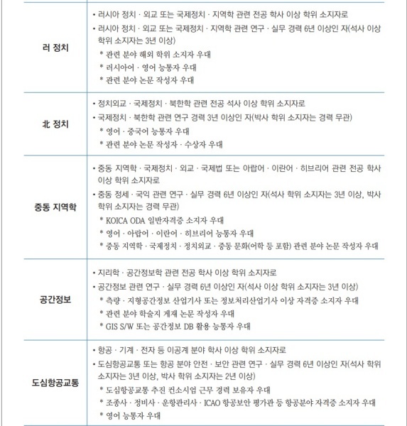•외교·국방·통일 관련 기획·전략 수립 연구·실무 경력 1년 이상인 자(외교·국방·통일· 안보 관련 전공 박사 학위 소지자는 경력 무관)
