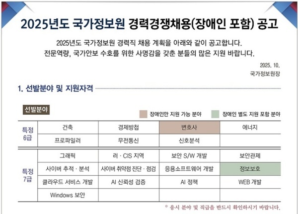 ▲ 2025년도 국가정보원 경력경쟁채용(장애인 포함) 공고 [출처=국가정보원]