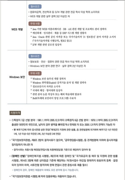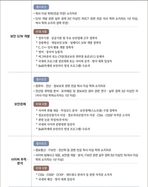 - 정보보호 S/W 개발 관련 경력 3년 이상인 자(석사 학위 소지자는 1년 이상, 박사 학위 소자지는 경력 무관) ▶ 우대사항
