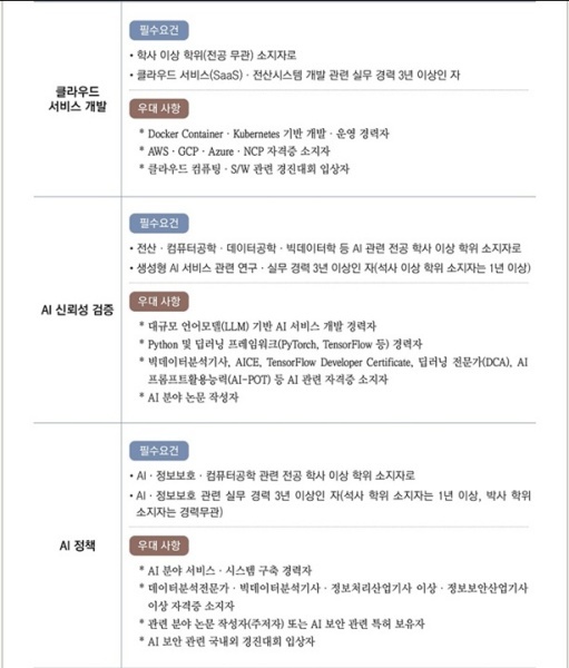 - AI·정보보호 관련 실무 경력 3년 이상인 자(석사 학위 소지자는 1년 이상, 박사 학위 소지자는 경력무관) ▶ 우대사항