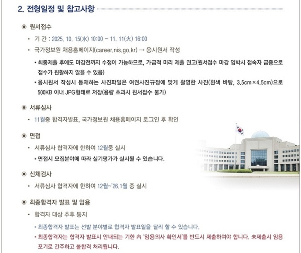 [국정원 채용 정보] 2025년도 국가정보원 경력경쟁채용(장애인 포함) 공고(원서접수 : 2025.10.15.(수) 10:00 ~ 11.11.(화) 16:00)