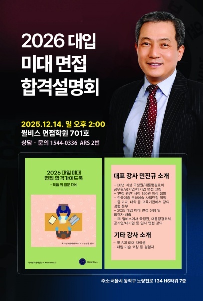 또한 지방에 거주하는 수험생의 편의를 제공하고자 면접강의는 1회에 한정해 진행할 계획이다. 설명회에 대한 문의나 참석 통지는 윌비스 면접학원 전화 1544-0336, ARS 2번으로 하면 된다.