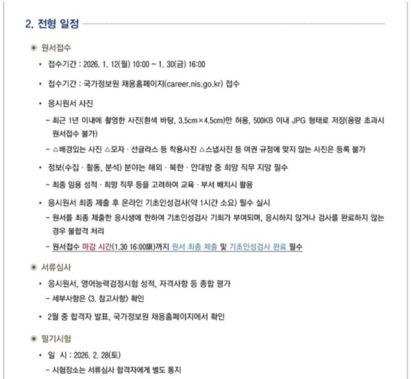 ▲ [국정원 채용 정보] 2026년 상반기 국가정보원 정기공채 공고[2026.1.12(월) 10:00 ~ 1.30(금) 16:00] [출처=국가정보원]