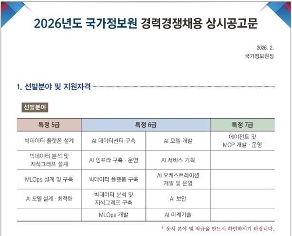 국가정보원(원장 이종석)에 따르면 2026년 2월2일(월) ‘AI 기반 업무 혁신’을 가속화 하기 위해 인공지능(AI) 분야 ‘전문 경력직’ 인재를 공개 채용한다.