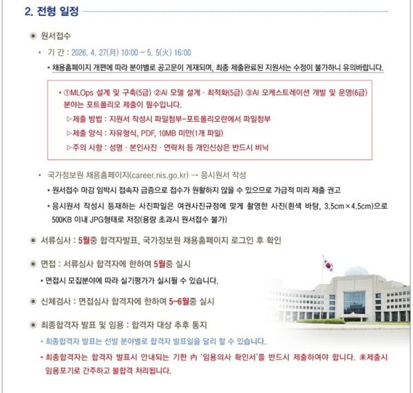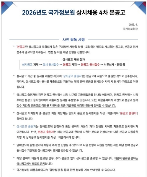 [국정원 채용 정보 - AI 분야 4차 본공고] 2026년도 국가정보원 경력직 상시채용 4차 본공고(원서접수 기간 : 2026.4.27(월) 10:00~5.5(화) 16:00)