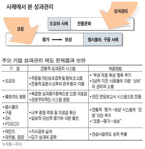 이런 형태의 시스템은 다수의 글로벌 기업에서 도입되고 있다. 미국 음료업체 펩시콜라는 전사-본부-팀-개인 간의 합의된 성과를 전체 부서원이 공유하고 있으며, 인터넷 기업인 구글은 개별 직원이 작성한 목표평가서를 분기별로 제출하도록 독려한다. 정지영 머서(MERCER) 부사장은 "국내 기업으로는 SK와 POSCO가 이와 같은 코칭 프로세스를 성공적으로 도입하고 있다"고 설명했다.