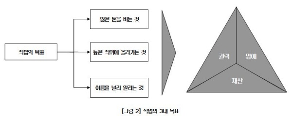 사람이 직업을 선택하는 목표는 사람마다 다르지만 <그림 2>와 같이 돈, 명예, 권력 등 크게 3가지로 나눌 수 있다.