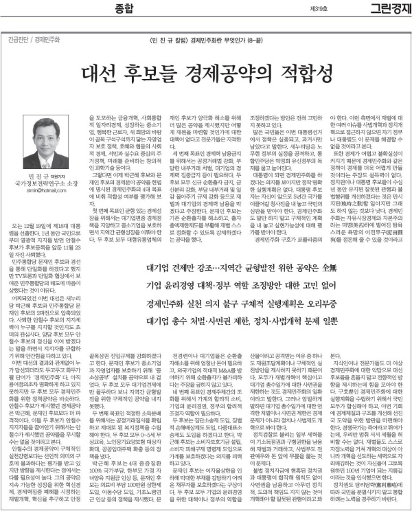 12월 05일자 신문에 실린 [긴급진단/경제민주화][민진규칼럼] 경제민주화를 어떻게 이해할 것인가] 8회 기사를 소개합니다.