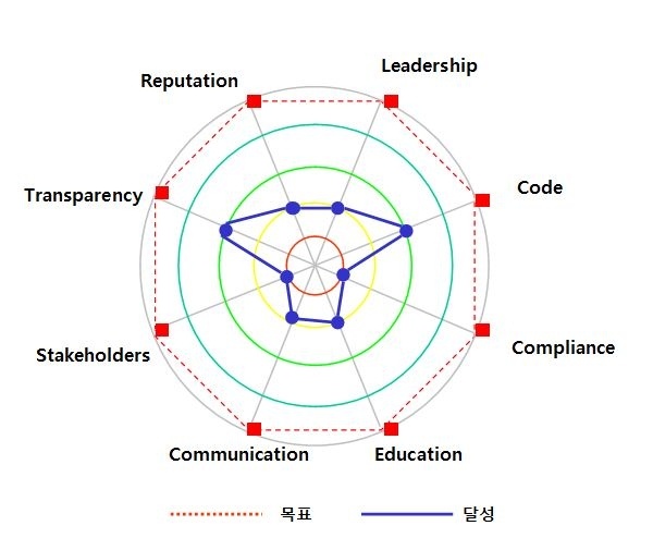 지금까지 진단한 내용을 바탕으로 ‘8-Flag Model’로 측정한 국민연금의 윤리경영 성취도를 종합하면 그림과 같다. 전반적으로 윤리경영은 보통수준이지만 윤리헌장, 경영투명성 부문은 다른 공기업에 비해 높은 점수를 기록했다. 낙제점 수준을 보인 부문은 제도운영, 이해관계자 배려다. 나머지 리더십, 윤리교육, 의사소통, 사회가치 존중은 보통수준으로 평가할 수 있다.