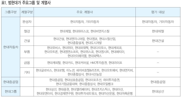 현대자동차그룹에서는 현대자동차, 기아자동차, 현대제철, 현대건설 등 4개 계열사, 현대중공업그룹은 현대중공업, 현대그룹은 현대상선을 대상으로 선택했다. 다른 기업들은 선정된 기업들과 직·간접적으로 지분이나 사업관계로 엮여 있어 독립성이 약하다는 점도 평가대상에 포함시키지 않은 이유다. 현대모비스도 급여나 이익측면에서 초우량기업으로 평가할 수 있으나 기술경쟁력, 사업구조 등에서 부족한 점이 많아 평가대상에 포함시키지 않았다.