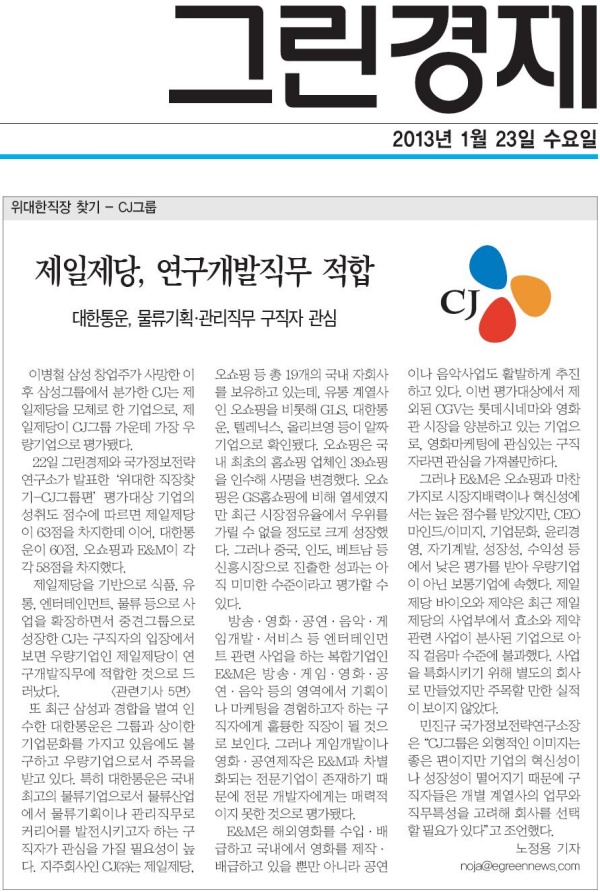 [위대한 직장찾기 7-1]CJ그룹, 제일제당, 연구개발직무 적합[국가정보전략연구소]