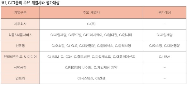 먼저 지주회사인 CJ㈜는 CJ제일제당㈜, ㈜CJ오쇼핑 등 총 19개의 국내 자회사를 보유하고 있다. 식품 & 식품서비스 계열은 CJ제일제당(이하 제일제당), CJ푸드빌, CJ프레시웨이, CJ엠디원, CJ엔시티 등이 있다. 제일제당은 CJ의 모기업으로 설탕을 제조·판매한다. 삼성 창업주 이병철 회장이 삼성상회를 하다가 제조업에 뛰어들어 만든 기업이 제일제당과 제일모직이다. 초창기 일본에서 제조장비를 들여다 설탕의 국산화에 성공해 삼성그룹의 기틀을 마련할 수 있었던 기업으로 대표성을 띠고 있다. CJ푸드빌은 식자재유통을 한다. 이 중 평가대상 기업은 대표성을 감안해 제일제당을 선택했다.