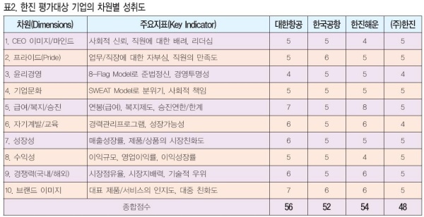 ▲ 한진그룹 평가대상 기업 차원별 성취도