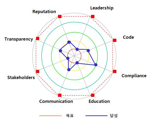 지금까지 진단한 내용을 바탕으로 ‘8-Flag Model’로 측정한 지역난방공사 윤리경영 성취도를 종합하면 그림과 같다. 지역난방공사의 윤리경영은 상장기업이라는 특성에도 불구하고 다른 공기업과 비교해 특별히 개선된 영역은 보이지 않았다. 가장 높은 점수를 받은 영역은 제도운영이다. 기업을 공개하면서 윤리경영 의지를 대외적으로 표시하기 위해 형식적인 제도에 대한 고민을 많이한 결과로 판단된다. 아쉬운 점은 제도구비에 들인 노력의 절반만 운영에 투입했다면 좋았을 것이다.