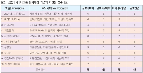 [위대한 직장찾기 13-1:금호아시아나그룹]금호아시아나그룹 평가대상 기업의 차원별 점수비교[국가정보전략연구소]