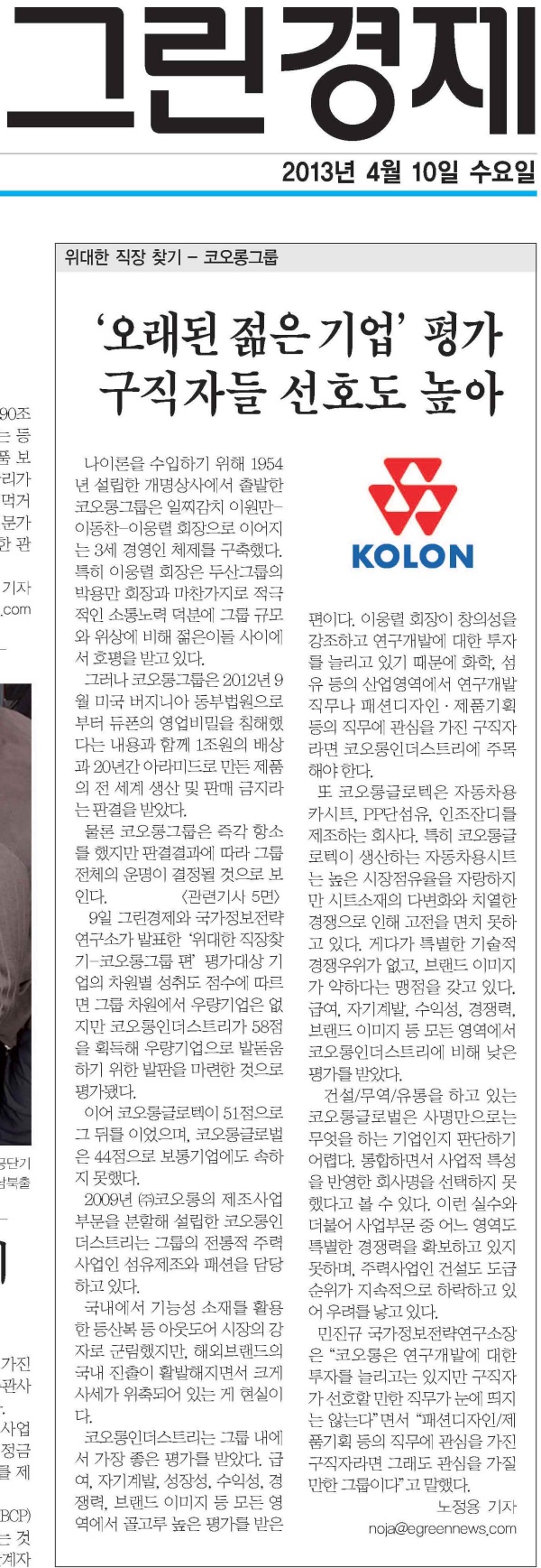 [위대한 직장찾기 18-1:코오롱그룹]오래된 젊은 기업 평가 구직자들 선호도 높아[국가정보전략연구소]