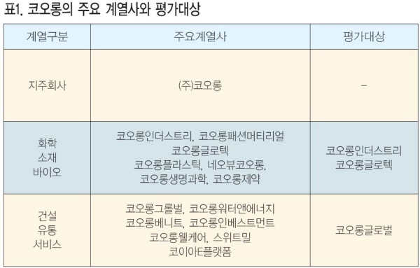 [표1. 코오롱의 주요 계열사와 평가대상]