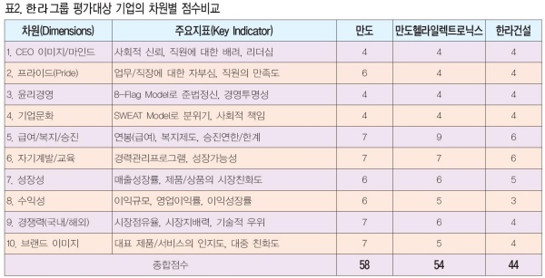 [위대한 직장찾기 21-1:한라그룹]한라그룹 평가대상 기업의 차원별 점수비교[국가정보전략연구소]