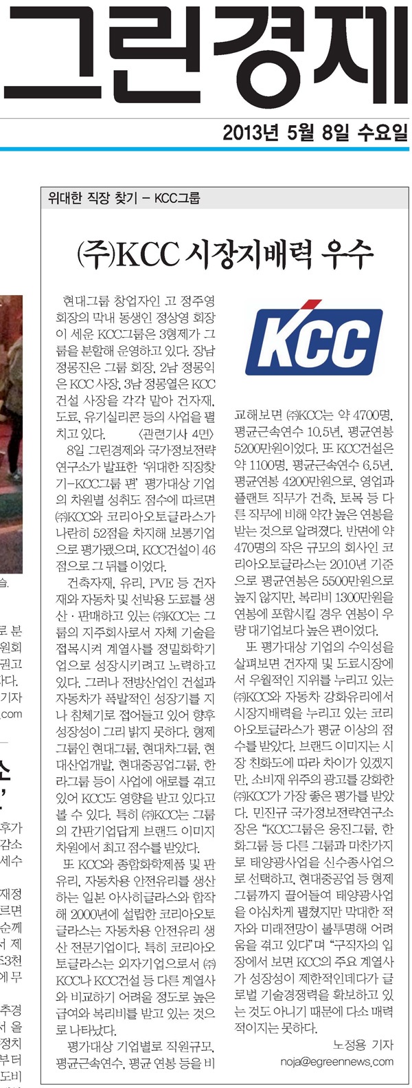 [위대한 직장찾기 22-1:KCC그룹](주)KCC 시장지배력 우수[국가정보전략연구소]