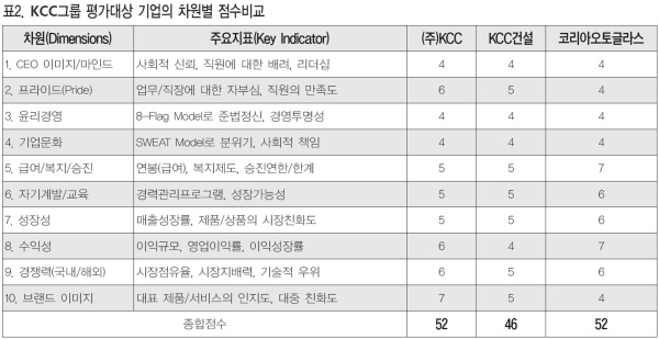[위대한 직장찾기 22-1:KCC그룹]KCC그룹 평가대상 기업의 차원별 점수비교[국가정보전략연구소]