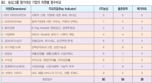 전체 평가에서 ㈜농심은 급여, 자기계발, 경쟁력, 브랜드 이미지 차원(dimension)을 중시하는 구직자에게 유리하고, 율촌화학은 성장성, 수익성을 우선적으로 고려하는 구직자가 관심을 가질 만 한 기업으로 평가됐다.