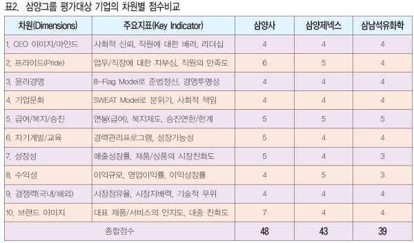 [위대한 직장찾기 25-1:삼양그룹]표2. 삼양그룹 평가대상 기업의 차원별 점수비교[국가정보전략연구소]