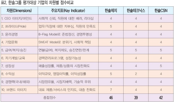 [위대한 직장찾기 26-1:한솔그룹]한솔그룹 평가대상 기업의 차원별 점수비교[국가정보전략연구소]