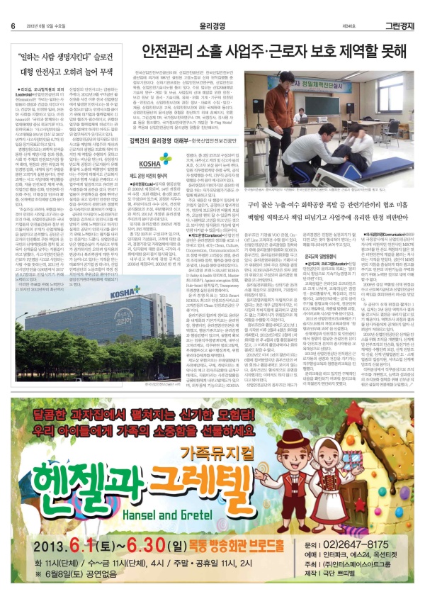 2013년 06월 12일자 신문에 실린 [윤리경영 대해부] 한국산업안전보건공단 편 기사를 소개합니다.
