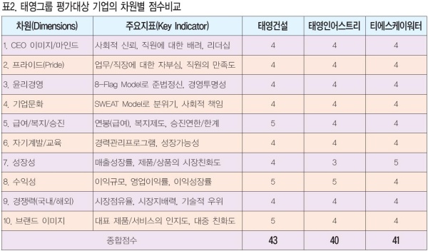 [위대한 직장찾기 28-1:태영그룹]표2. 태영그룹 평가대상 기업의 차원별 점수비교[국가정보전략연구소]