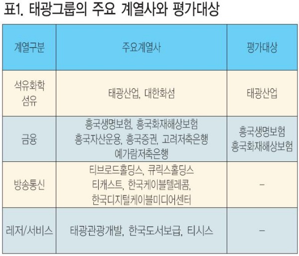 [위대한 직장찾기 31-2:태광그룹]표1. 태광그룹의 주요 계열사와 평가대상[국가정보전략연구소]
