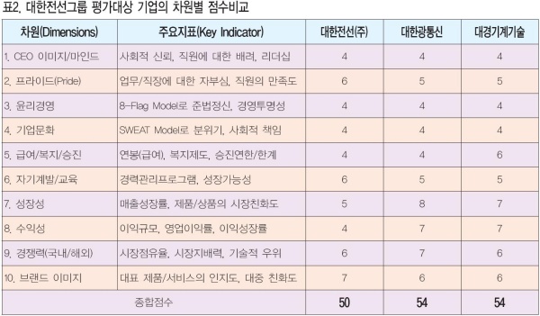 민진규 국가정보전략연구소장은 “대한광통신은 자기계발 가능성과 브랜드 이미지 차원에서는 대한전선보다 낮은 평가를 받았지만, 성장성, 수익성, 경쟁력 등의 차원에서는 높은 점수를 받았다. 광통신 시장이 급격하게 팽창하고 있으며, 관련 부문 기술력을 확보하고 있다는 점이 긍정적으로 평가됐다. 대경기계기술은 대한광통신보다 성장성이나 경쟁력 차원에서 낮은 점수를 받았지만 제조기업임에도 불구하고 급여가 높아 대등한 수준의 기업이라는 평가를 받았다”고 설명했다.