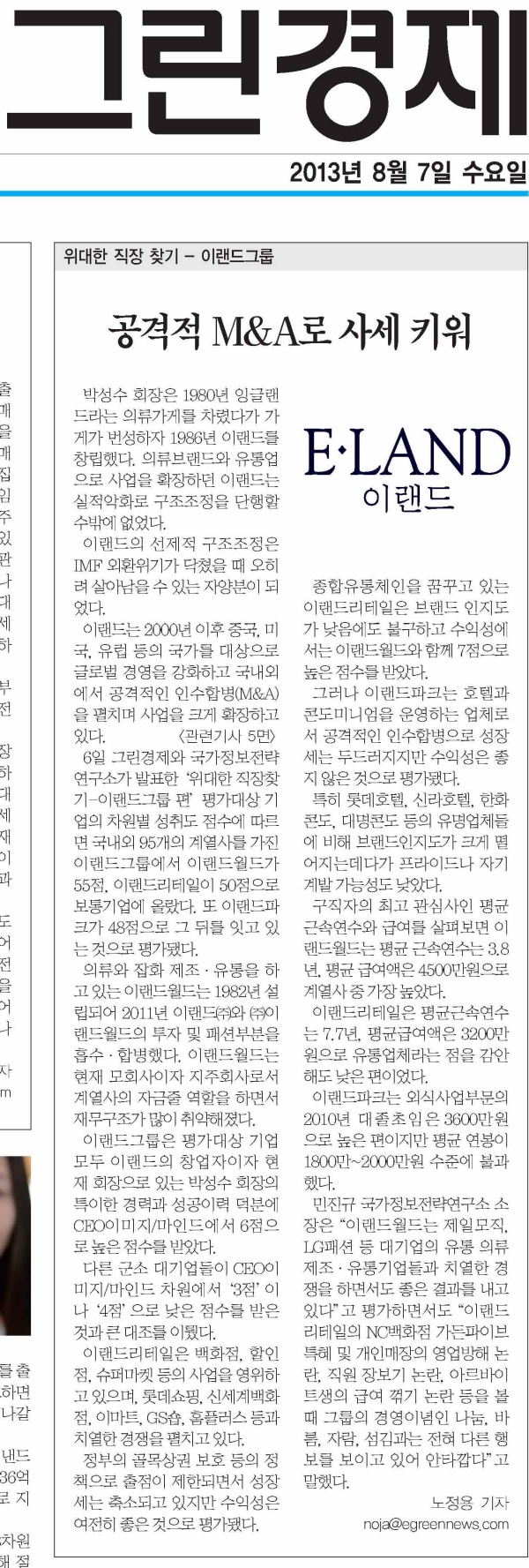 [위대한 직장찾기 35-1:이랜드그룹]공격적 M&A로 사세 키워[국가정보전략연구소]