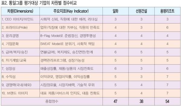 ▲ 통일그룹 평가대상 기업의 차원별 점수 비교