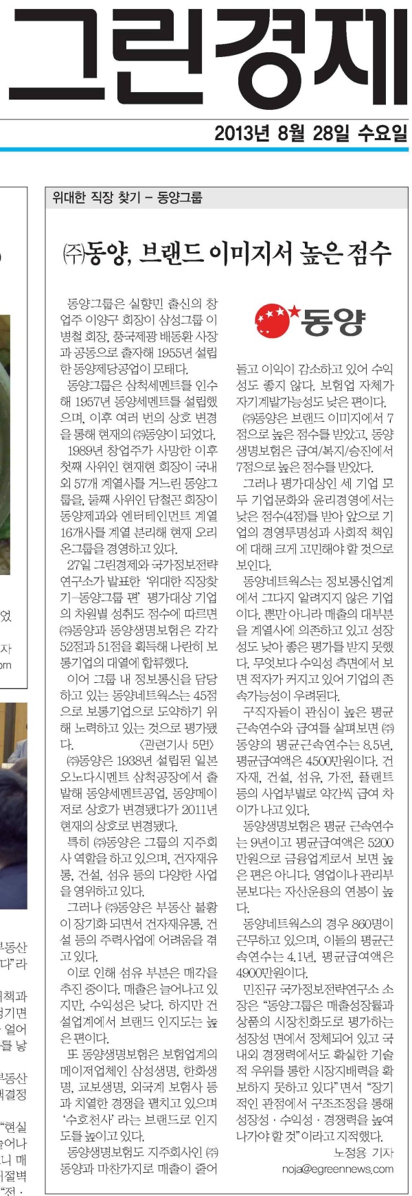 [위대한 직장찾기 38-1:동양그룹](주)동양, 브랜드 이미지서 높은 점수[국가정보전략연구소]