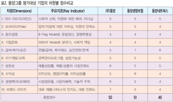 ㈜동양은 브랜드 이미지에서 7점으로 높은 점수를 받았고, 동양생명보험은 급여/복지/승진에서 7점으로 높은 점수를 받았다. 그러나 평가대상인 세 기업 모두 기업문화와 윤리경영에서는 낮은 점수(4점)를 받아 앞으로 기업의 경영투명성과 사회적 책임에 대해 크게 고민해야 할 것으로 보인다.