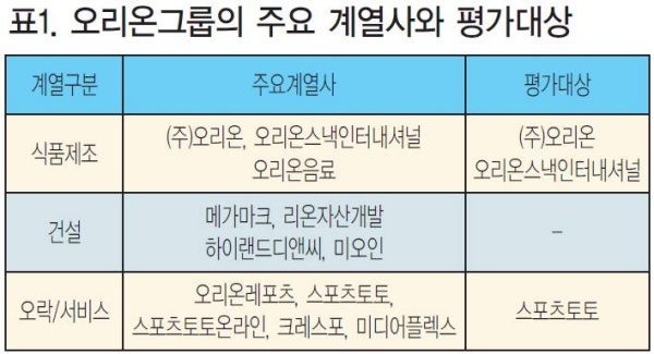 [위대한 직장찾기 42-2:오리온그룹]표1. 오리온그룹의 주요 계열사와 평가대상[국가정보전략연구소]