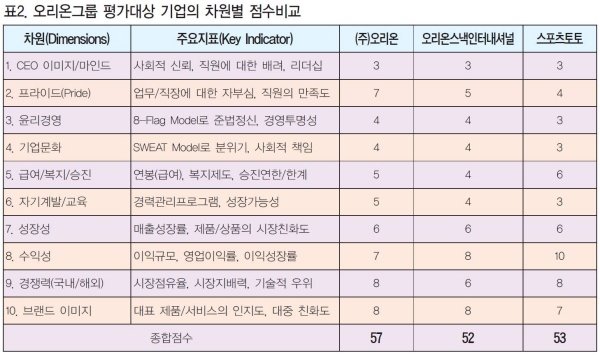 ▲ 오리온그룹 평가대상 기업의 차원별 점수비교