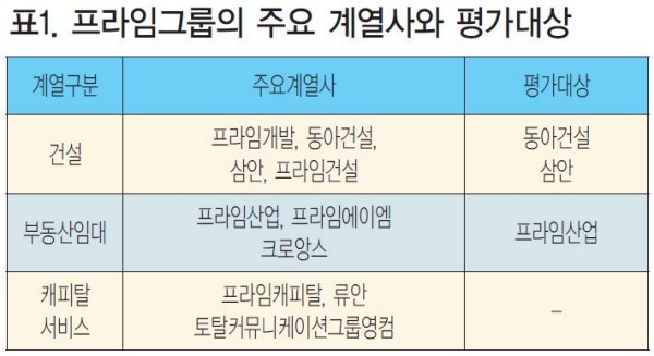 프라임은 국내 25개, 해외 4개 등 총 29개의 계열사를 가지고 있으며, 주요 계열사는 표1과 같이 건설, 부동산임대, 캐피탈/서비스 등으로 구분할 수 있다.