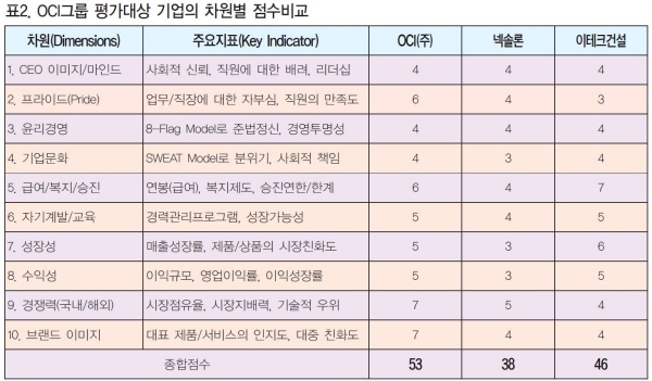 [위대한 직장찾기 44-1:OCI그룹]표2. OCI그룹 평가대상 기업의 차원별 점수비교[국가정보전략연구소]