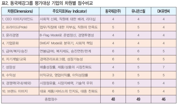 [위대한 직장찾기 45-1:동국제강그룹]동국제강그룹 평가대상 기업의 차원별 점수비교[국가정보전략연구소]