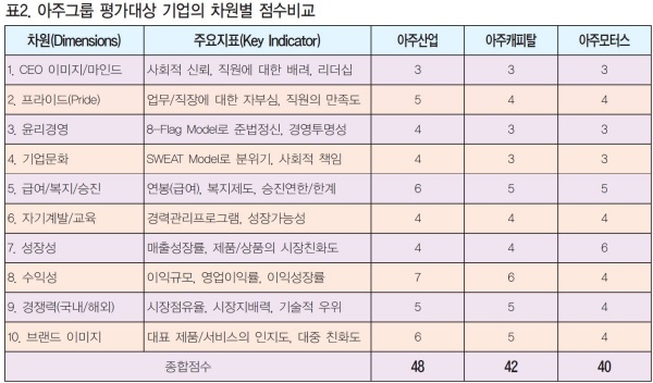 아주모터스는 매출이 지속적으로 늘어나면서 성장성에서는 6점으로 좋은 평가를 받았다. 하지만 다른 모든 차원에서는 평균 이하의 점수를 받아 평가대상 중 가장 낮은 점수를 받은 기업이 되었다.