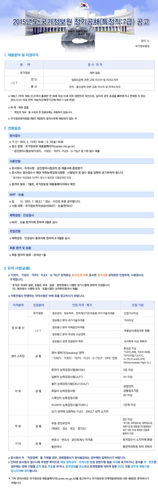 2015년도 국가정보원 정기 공채 (특정직 7급) 공고