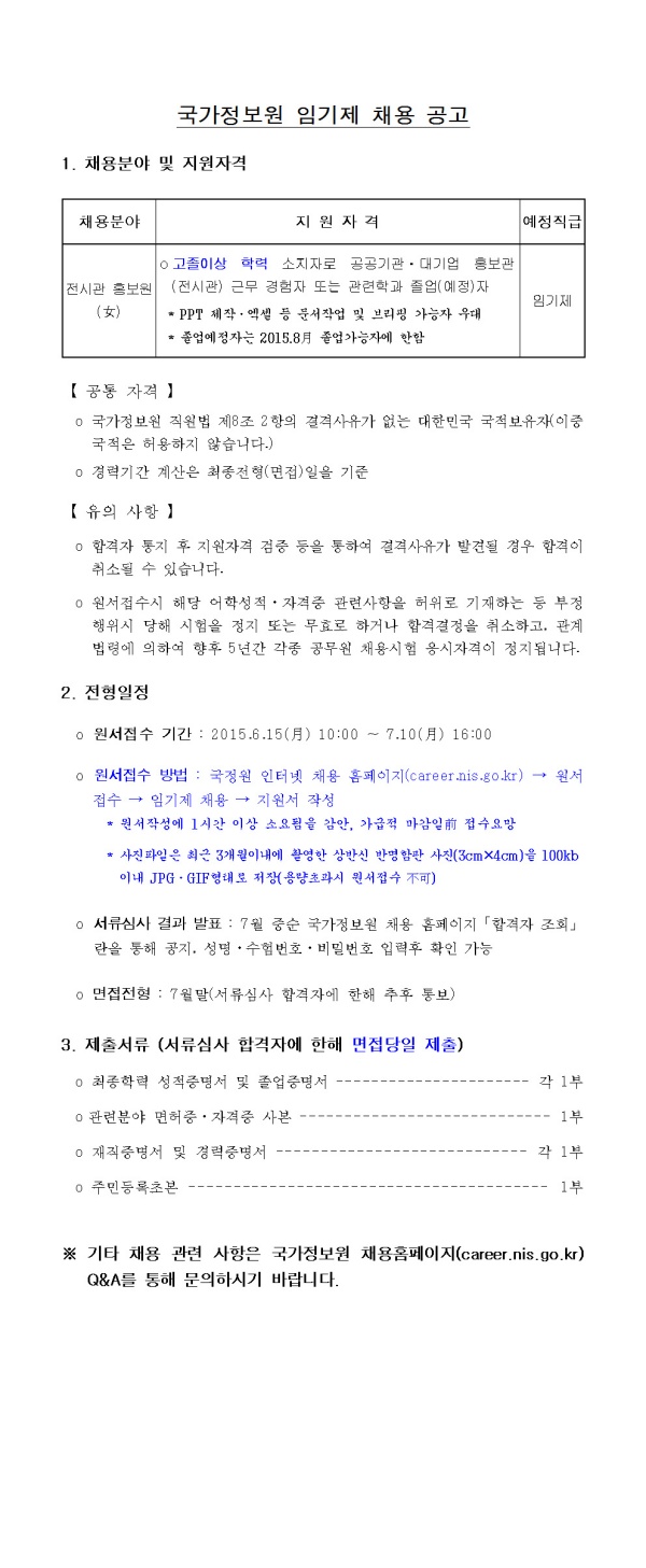 [국정원채용안내]2015년 임기제 전시관 홍보원(女) 채용[2015.06.15~2015.07.10]