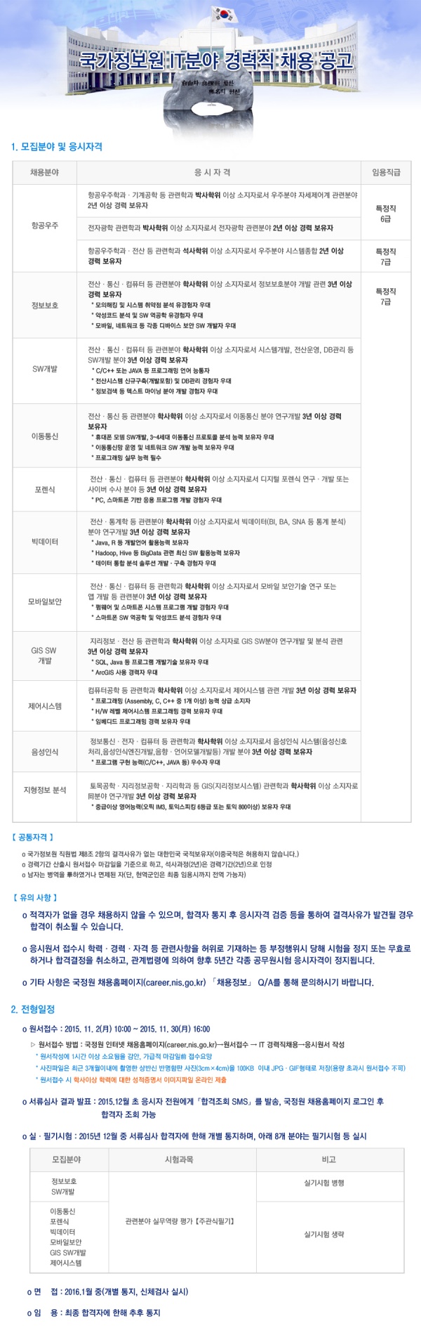 [국정원채용안내] 2015년 IT분야 경력직(특정직 7급) 채용 [2015.11.02~2015.11.30]