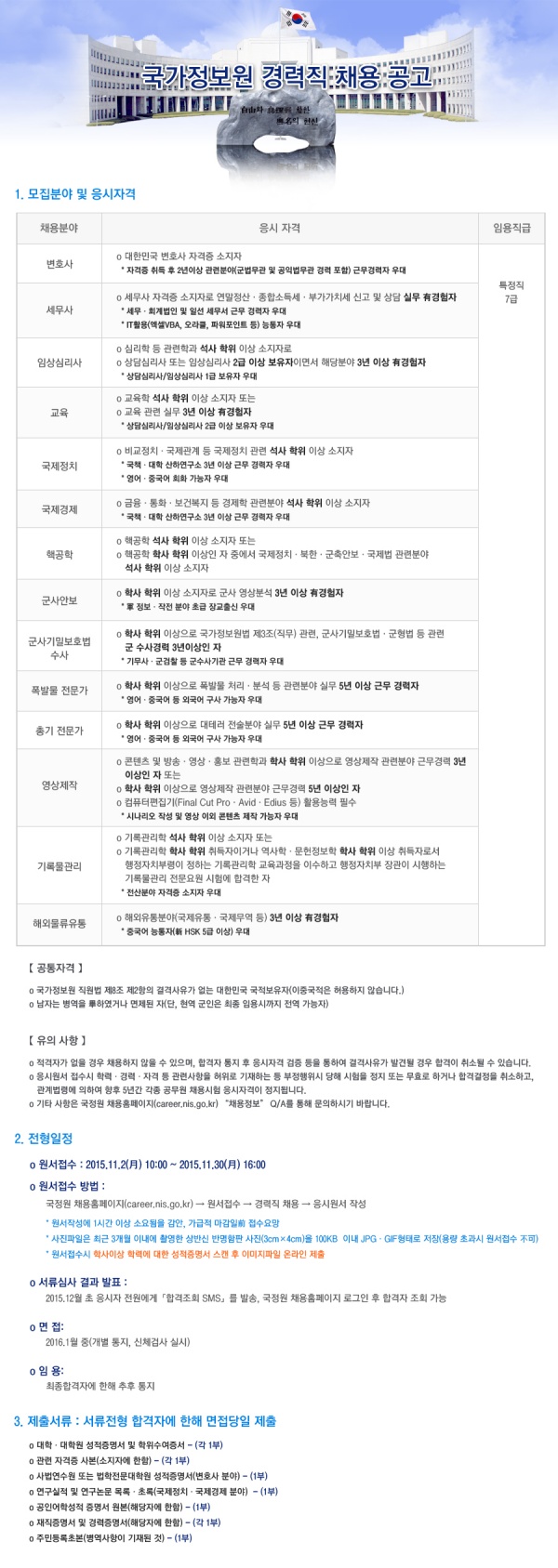 [국정원채용안내] 2015년 경력직(특정직 7급) 채용 [2015.11.02~2015.11.30]