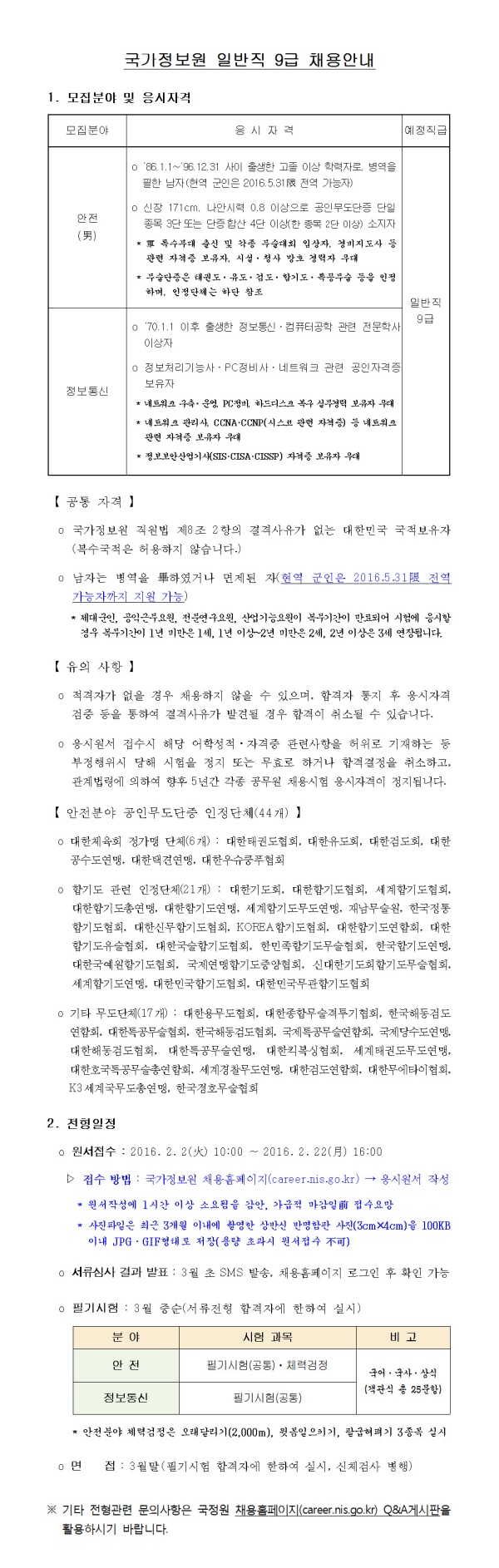 [국정원채용안내] 2016년 일반직 9급채용안내[2016.02.02~2016.02.22]