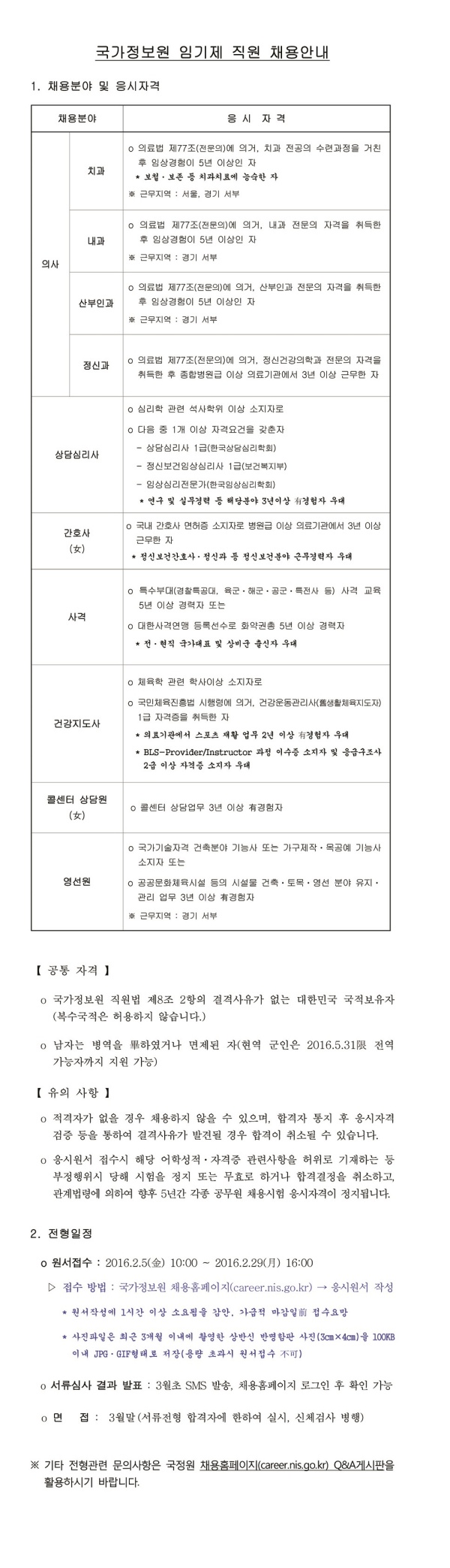 [국정원채용안내] 2016년 임기제 직원 채용안내[2016.02.05~2016.02.29]